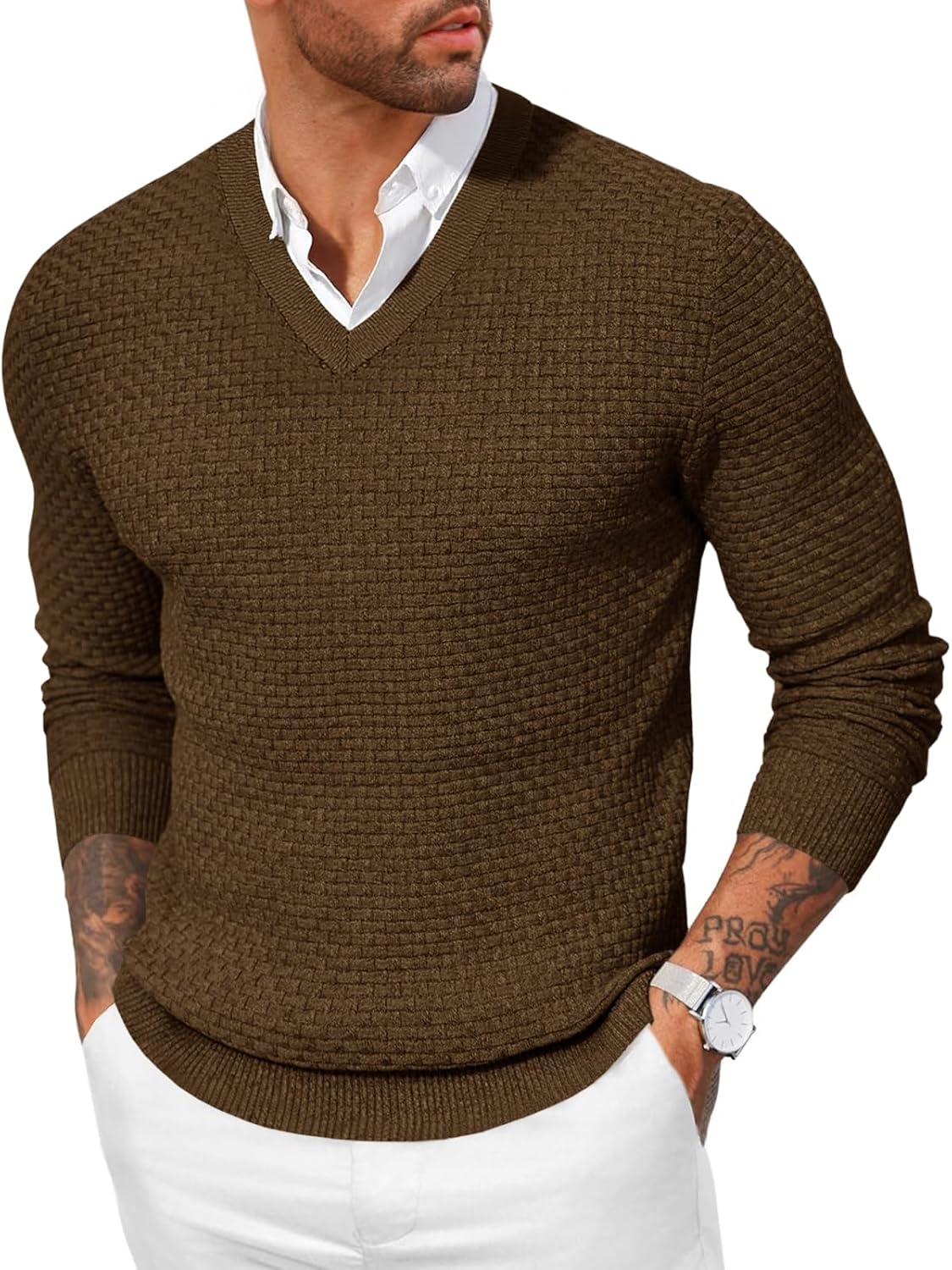Yousify Mens V Neck Pullover Sweater Waffle Knit Casual Textured Pullover Long Sleeve Slim Fit Fall Sweaters