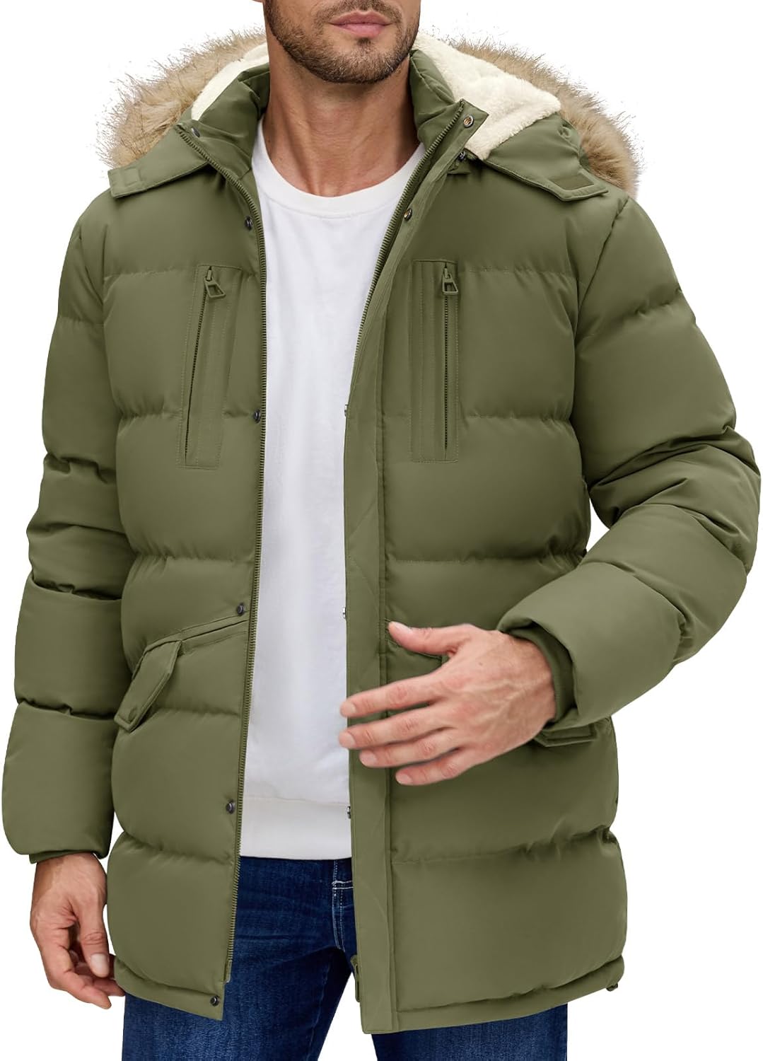Men's Long Winter Coat Warm Thicken Water Resistant Jacket Fleece Windproof Parka Coat with Detachable Hood