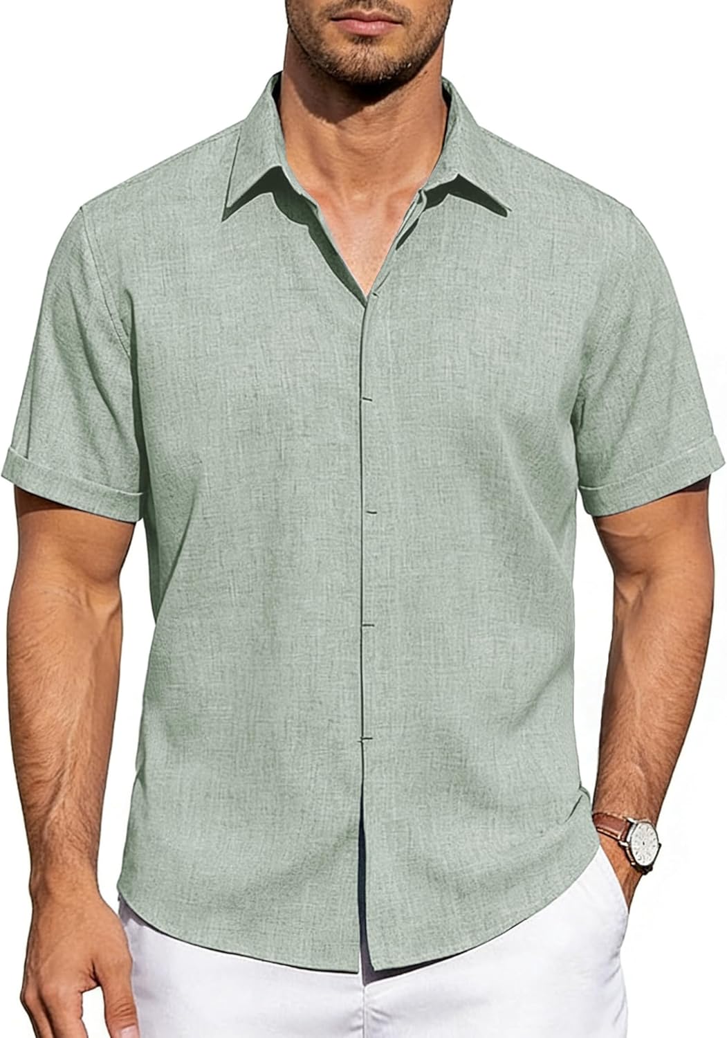 Mens Linen Shirts Short Sleeve Casual Shirt Button Down Summer Beach Vacation Tops Men Casual Dress Shirts Breathable