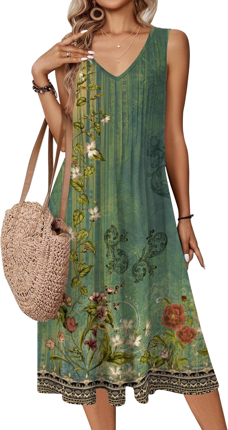 Zeagoo Women Summer Casual Dresses 2026 Sleeveless Midi Pleated Tank Sundress with Pockets V Neck A Line Swing Tshirt Dress