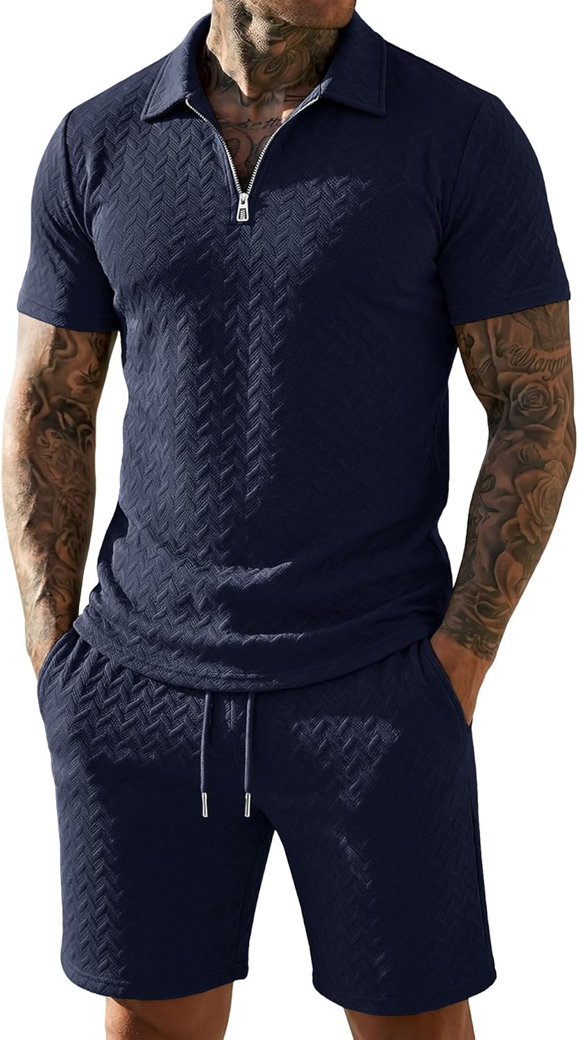 URRU Mens Textured Polo Shirt and Shorts Sets Outfits 2 Piece Summer Tracksuits Casual Quarter Zip Golf Polo Shirts