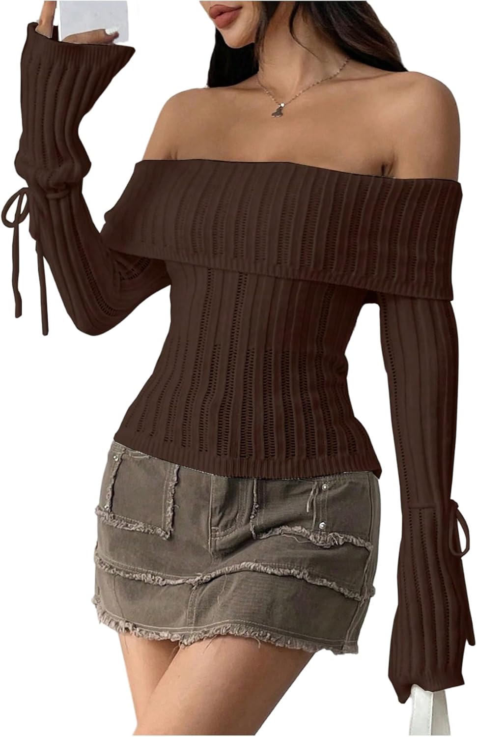 SweatyRocks Women's Off Shoulder Sweater Bell Long Sleeve Flared Bow Tie Slim Fit Knit Tops
