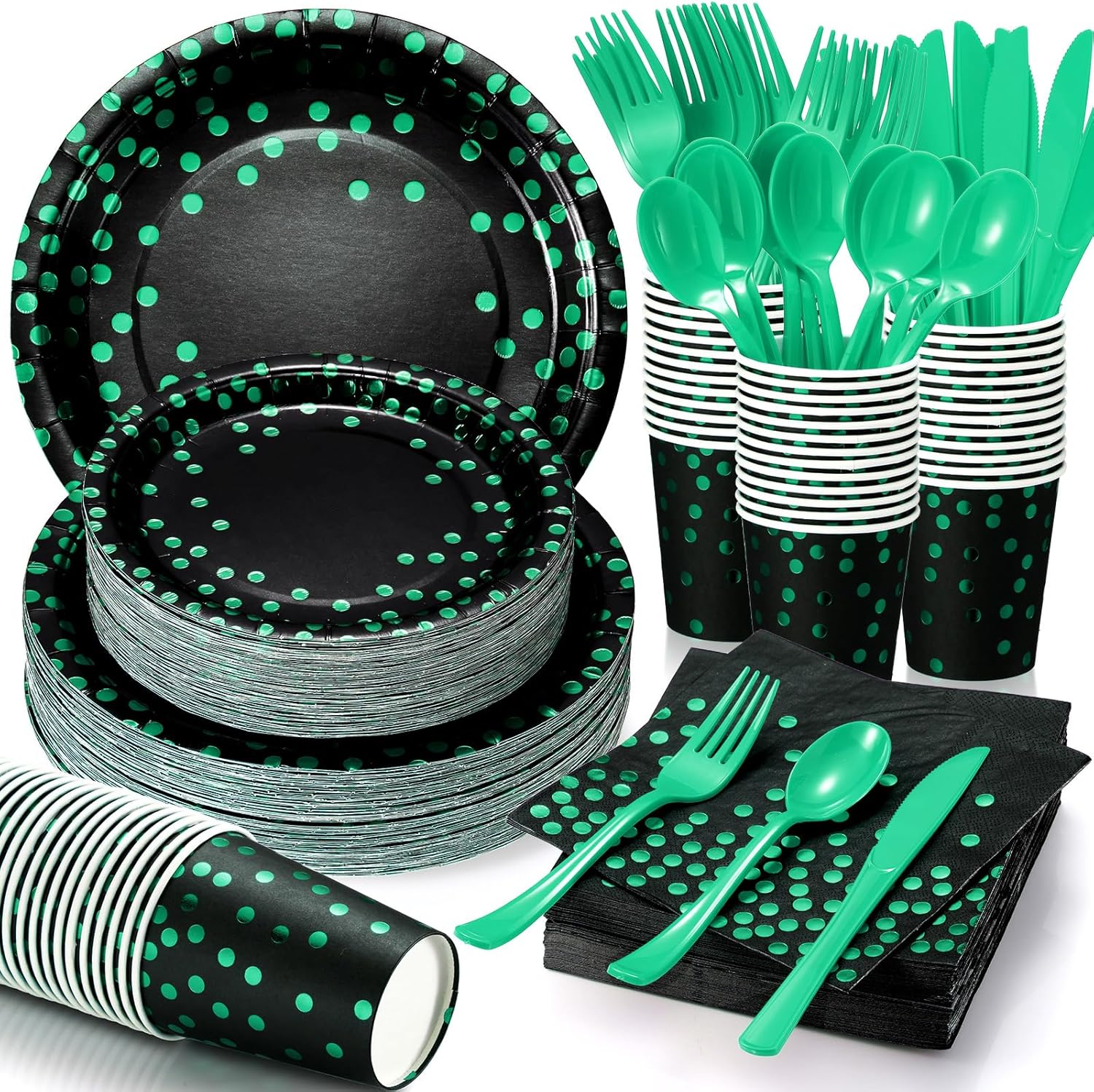 - Sufficient Party Decorations: the black and green party supplies contain 80 pieces of 9 inches black paper plates, 80 pieces of 7 inches dessert plates, 80 pieces of 9 oz paper cups, 80 pieces of 13 x 13 inches napkins (unfolding size), 80 pieces of knives, 80 pieces of forks, 80 pieces of spoons, 560 pieces in total, adequate to meet your various party needs, allowing you to serve 80 guests at a time