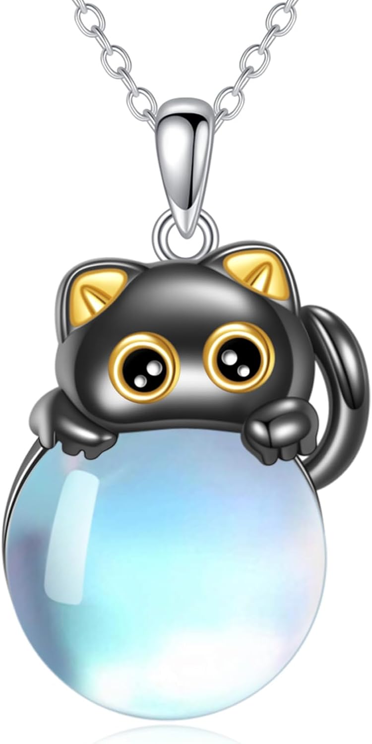 VONALA Black Cat Necklace for Women 925 Sterling Silver Moonstone Cat Pendant Animal Jewelry Gifts for Her