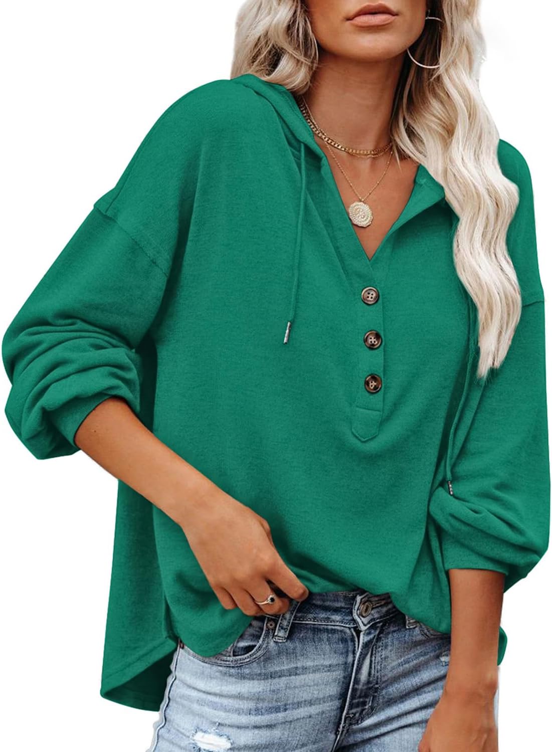Womens V Neck Button Down Hoodies Shirt Oversized Long Sleeve Hooded Henley Shirt Drawstring Pullover Tops