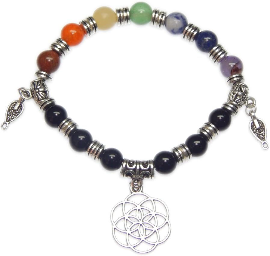 Multi color flower 8mm bead charm 7 chakra healing gemstone yoga stretchable bracelet