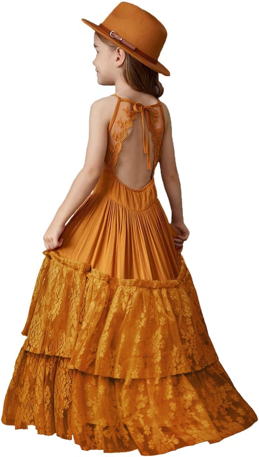 BIBIHOU Girls Kids Lace Back Full-Length Backless Tulle Party Holiday Formal Flower Girl Dress