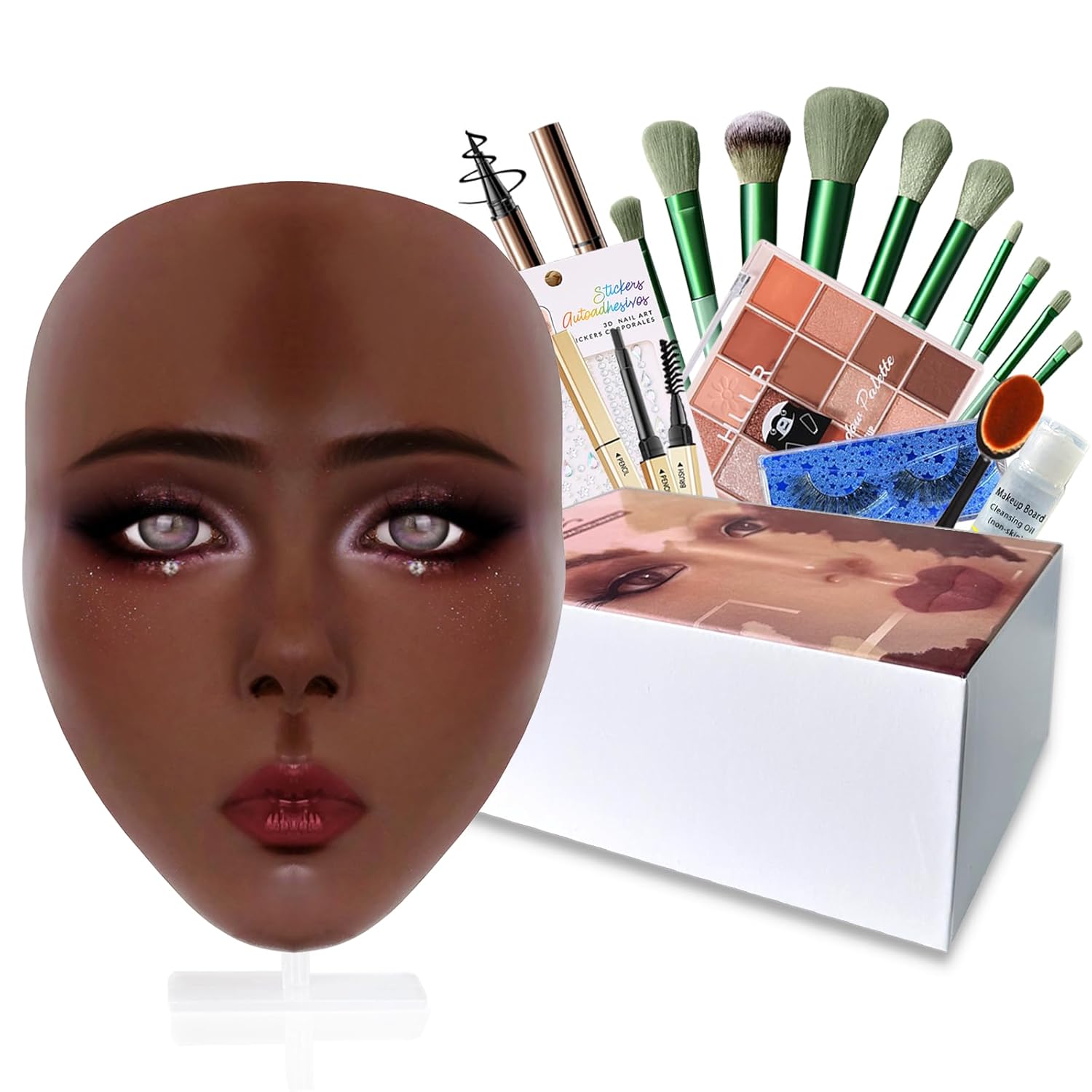 Silicone Makeup Practice Face Board Kit, Mannequin Face for Makeup Practice with Brushes Set & Eye Shadow & Rhinestones Sticker-Black