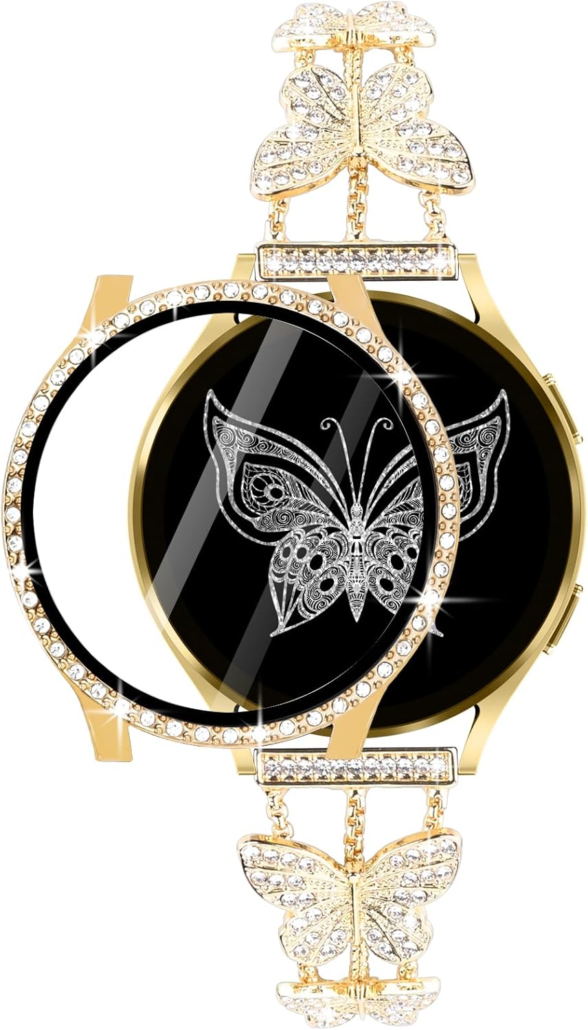 Bling Band with Case Compatible with Samsung Galaxy Watch 4 & 5 40mm 44mm Model,20mm Stylish Stainless Band Bling Diamond Butterfly Bracelet for Women (Rose Gold-40MM)