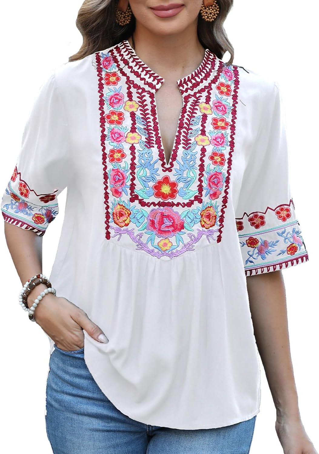 AK Women's Summer V Neck Boho Embroidered Mexican Shirts Short Sleeve Casual Tops Blouse