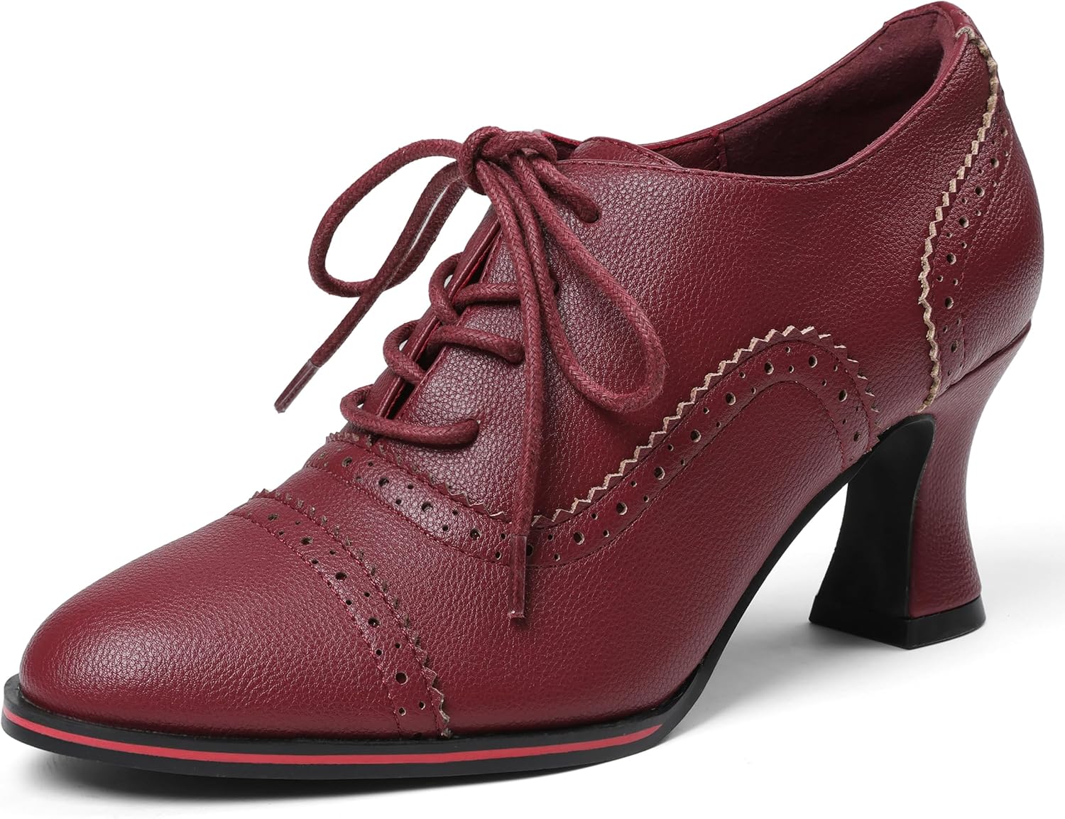 Women's Black Oxfords Dress Wingtip Vintage Comfortable Chunky High Heel Lace Up Brogues Booties