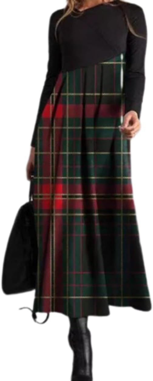 MEROKEETY Women's Long Sleeve Plaid Empire Waist Full Length Maxi Dress with Pockets