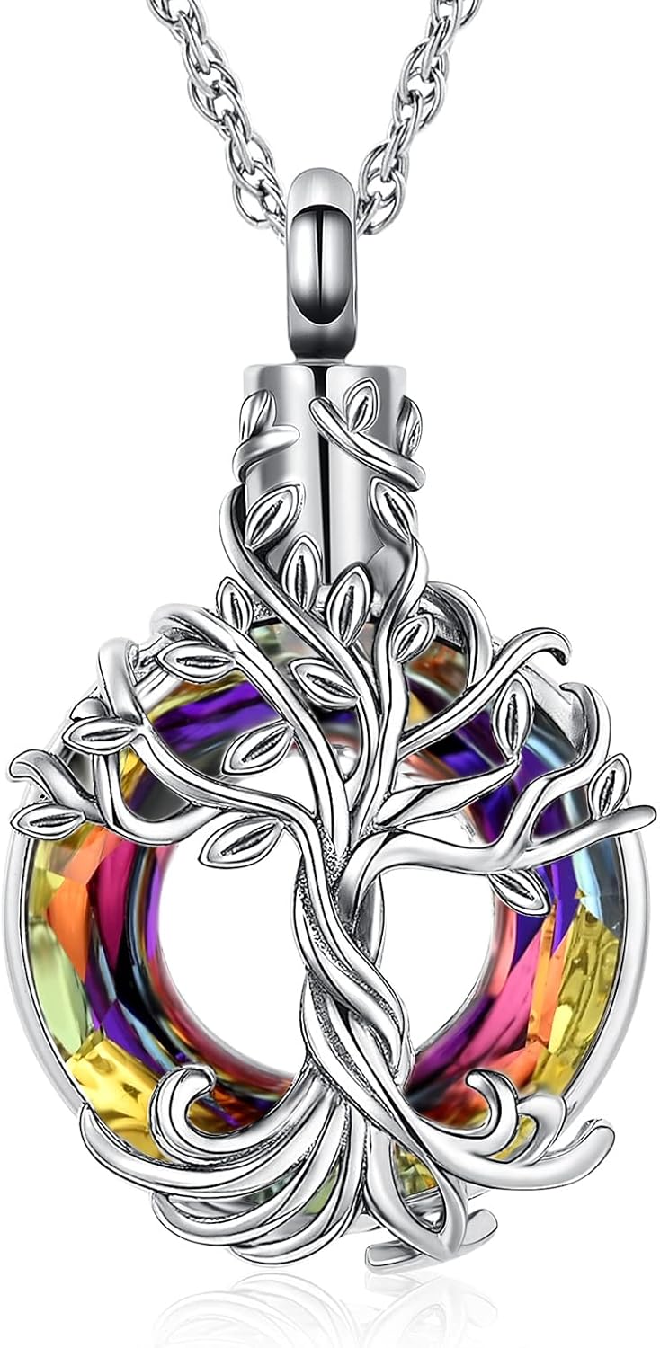 shajwo Tree of Life Cremation Urn Ashes Necklace for Women Men Circle of Life Cremation Crystals Ash Pendant Loved One Memorial Jewelry