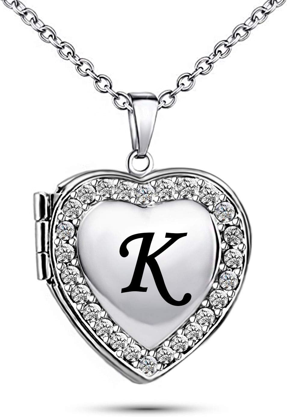 KunBead Name Initial Custom Heart Locket Letter Love Pendant Necklace for Women with Birthstone that Holds Pictures for Family