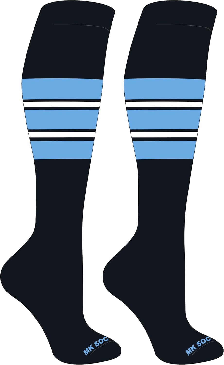 Striped Knee High Baseball, Football Socks (E) Black, Columbia Blue, White