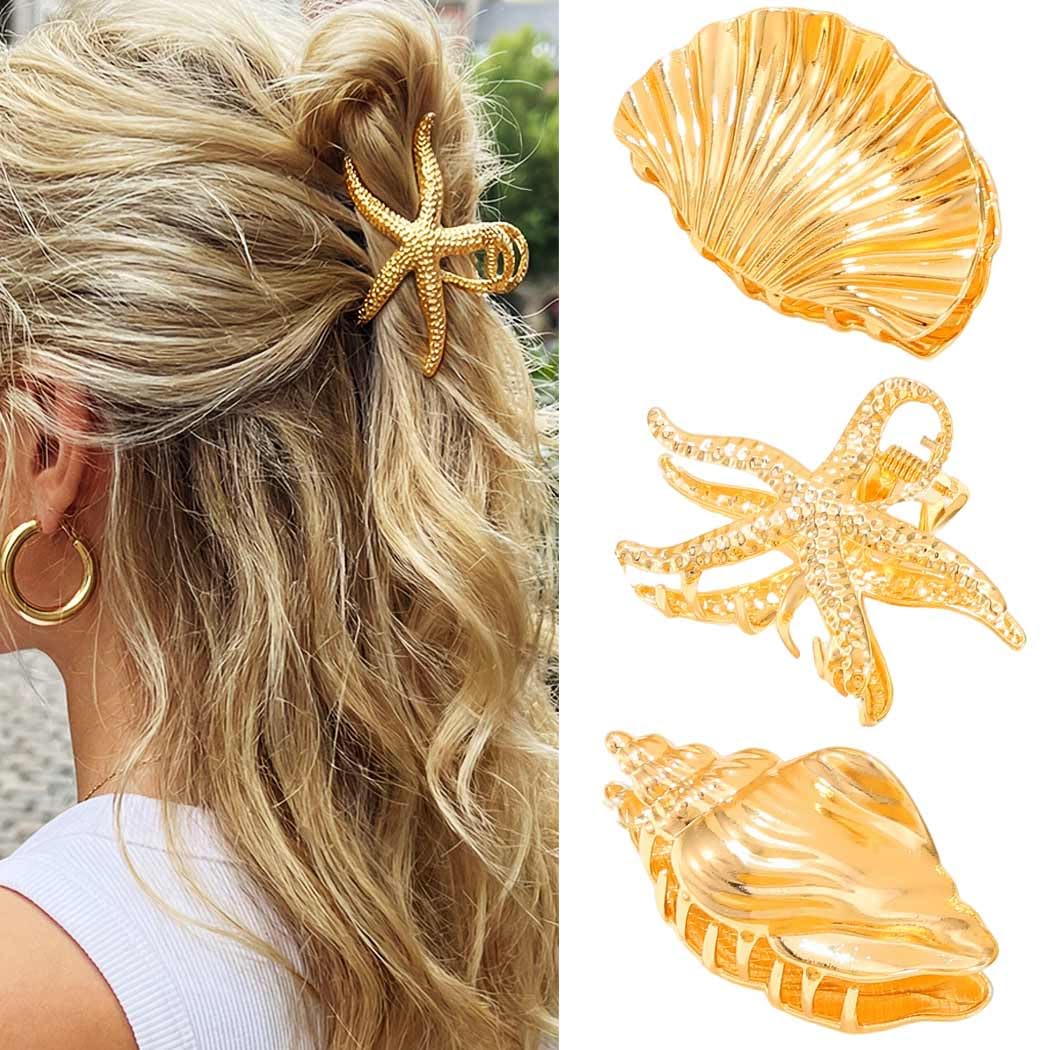 - Gold claw clip set for women with Starfish shape, Seashell shape and Conch shape, adds a touch of glamour to any look. Perfect for a pool party, beach vacation or summer festival. The shell pattern will complement swimwear and sarongs.