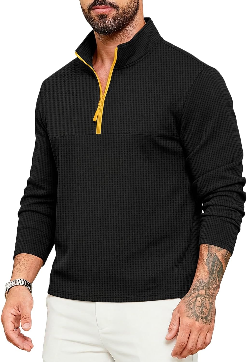 Mens Quarter Zip Pullover Waffle Knit Color Black Sweatshirts Athletic Long Sleeve Workout Shirts WT06