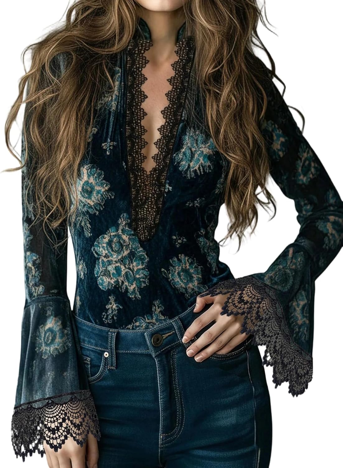 Lace Deep V Neck Velvet Blouse for Women Floral Print Lace Cuffs Long Flare Sleeve Blouse Tops