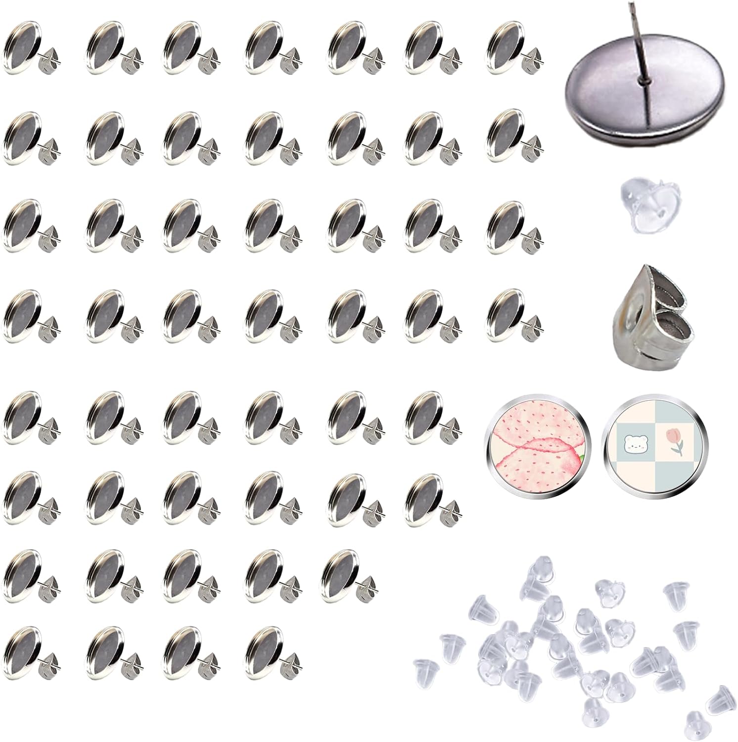 - Complete Stud Earring Kit for DIY Projects: This stud earring making kit includes 50 stainless steel cabochon earring posts, 50 stainless steel earring backs, and 50 rubber earring backs, providing everything you need to get started on your creative jewelry designs