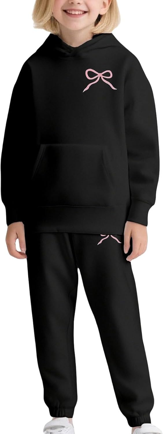 Girls Two Piece Outfits Bow Graphic Print Hoodie Sweatpants Set Oversized Sweatshirt and High Waist Sweatpants Cute Tracksuit