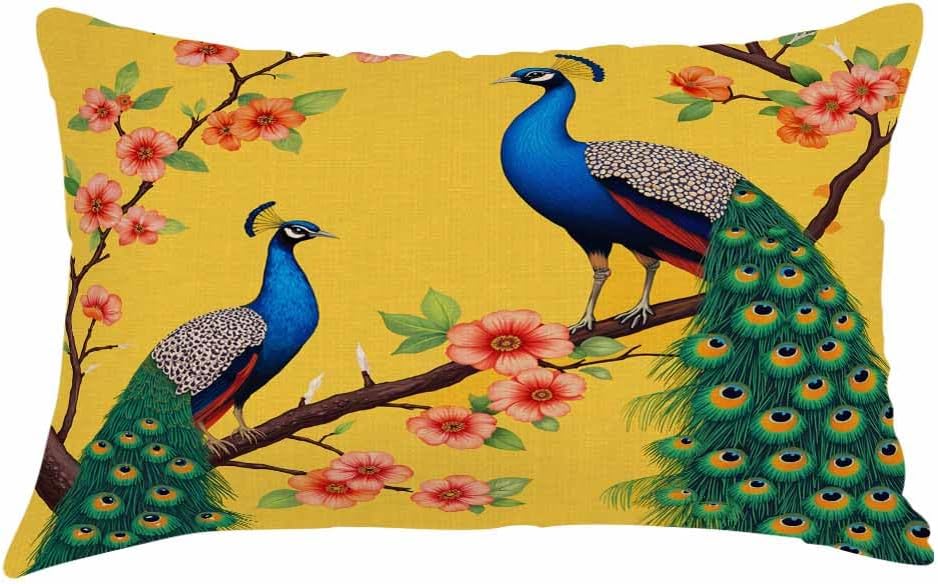 IBILIU Watercolor Peacocks Throw Pillow Covers 12x20 Inch,Cherry Tree Flower Colorful Bird Yellow Rectangle Lumbar Pillow Cover,Decorative Cotton Linen Cushion Covers for Bedroom,Sofa,Couch