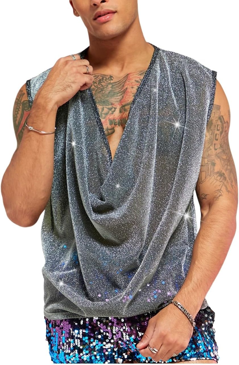 WDIRARA Men's Glitter Draped Collar T Shirts Cowl Neck Sleeveless Tank Top Party Top