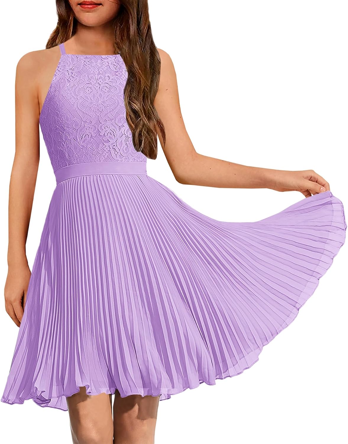HOSIKA Girls Halter Neck Summer Sleeveless Elegant Floral Lace Chiffon A-Line Flared Swing Party Dress for 6-12 Y