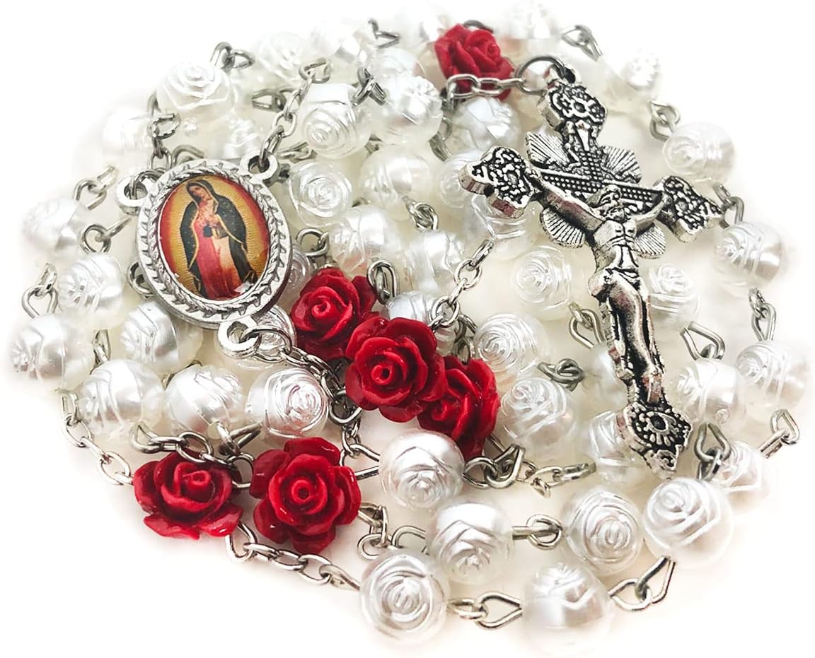 Our Lady of Guadalupe Pearly Rose Rosary Beads Catholic for Women - Catholic Gifts - Rosary Necklace for Women