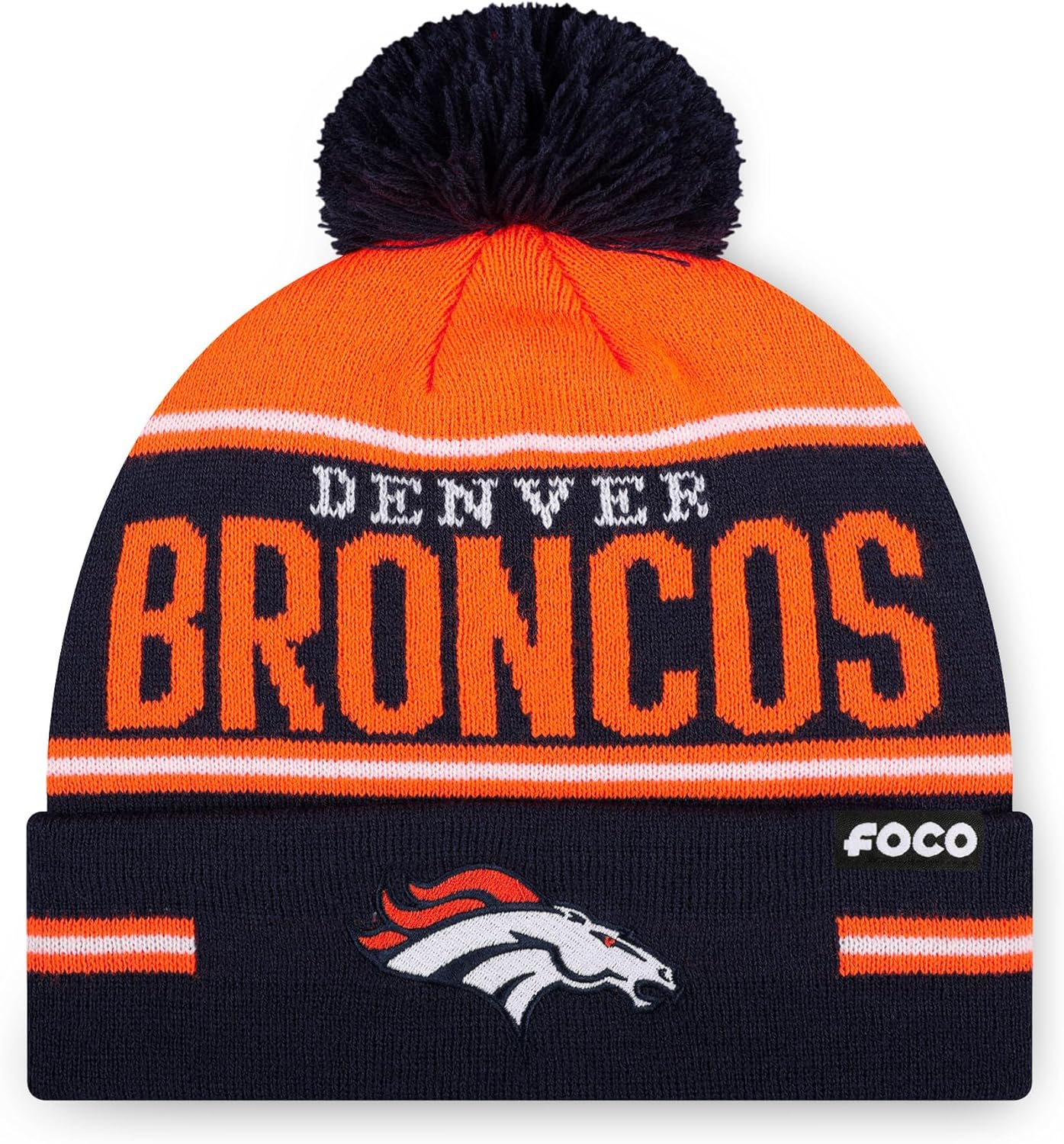 FOCO NFL Team Logo Big Wordmark Stripe Pom Beanie Hat