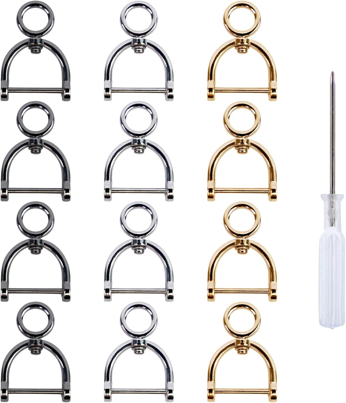 - Package Include : Comes with 12pcs Horseshoe Shape D Ring. 1pcs Screwdriver. Color : Silver , Black , Gold ,4pcs in each color.