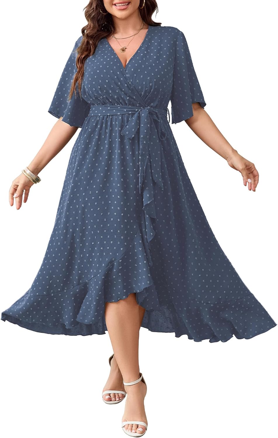 SCOMCHIC Women's Plus Size Summer Dresses Short Sleeve Wrap V Neck Swiss Dot Boho High Low Split Ruffle Maxi Dress