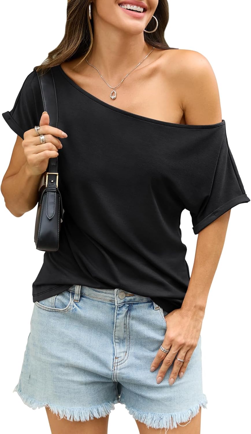 Womens Off Shoulder Tops Sexy Short Sleeve Shirts Rolled Sleeve Loose T Shirts Summer Going Out Clothes 2026