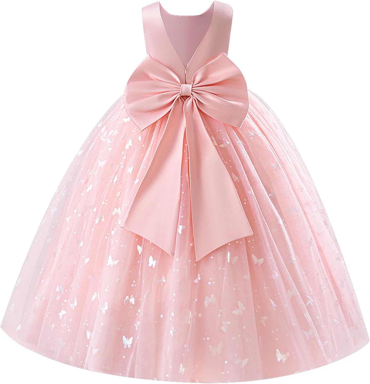 IDOPIP Butterfly Flower Girl V-Backless Bow Dress for Kids Wedding Pageant Party Long Gown Communion Birthday Tulle Dresses