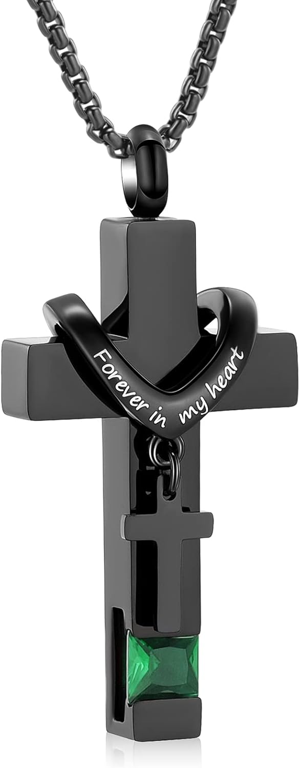 Oinsi Black Cross Urn Necklace For Ashes Of Loved Ones With Birthstone Always In My Heart Cremation Jewelry Keepsake Pendant Women Men