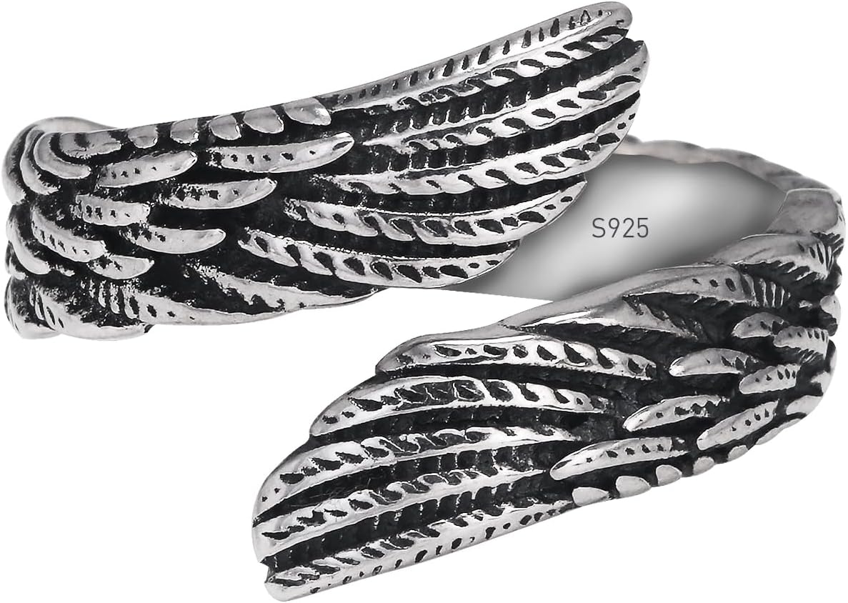 925 Sterling Silver Angel Wing Feather Ring for Women Men, Adjustable Open Band, Vintage Antique Style Jewelry