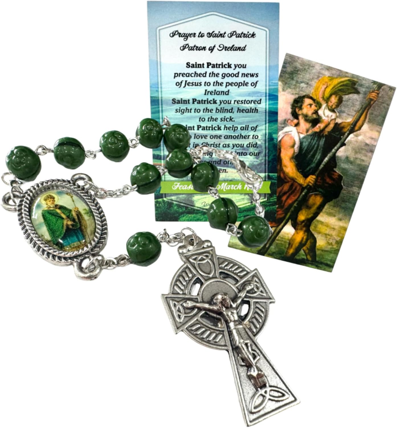 Westmon Works Irish Auto Rosary St Patrick Patron Saint of Ireland and St Christopher Italian Metal Car Rearview Mirror Charm with Two Holy Cards