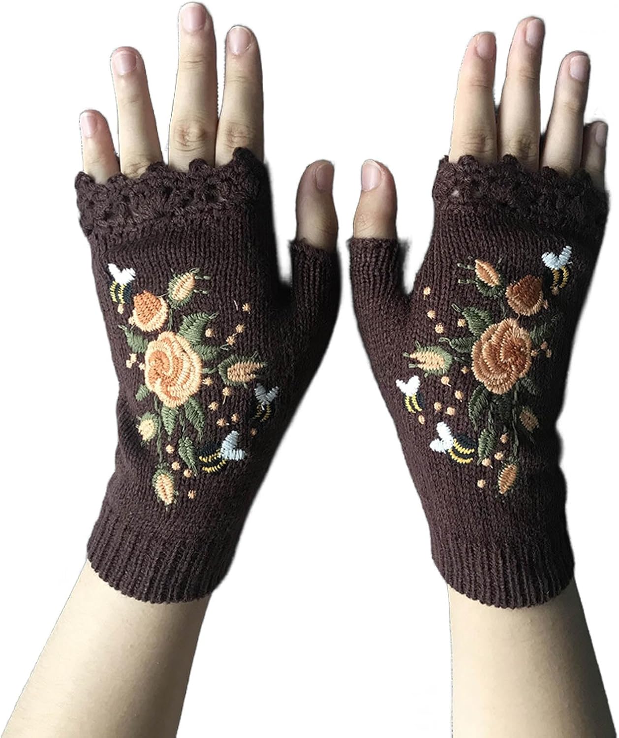 womfun Hand Embroidered Gloves Women's Knitted Gloves Flower Gloves,Embroidered Hand Fingerless Gloves for Women