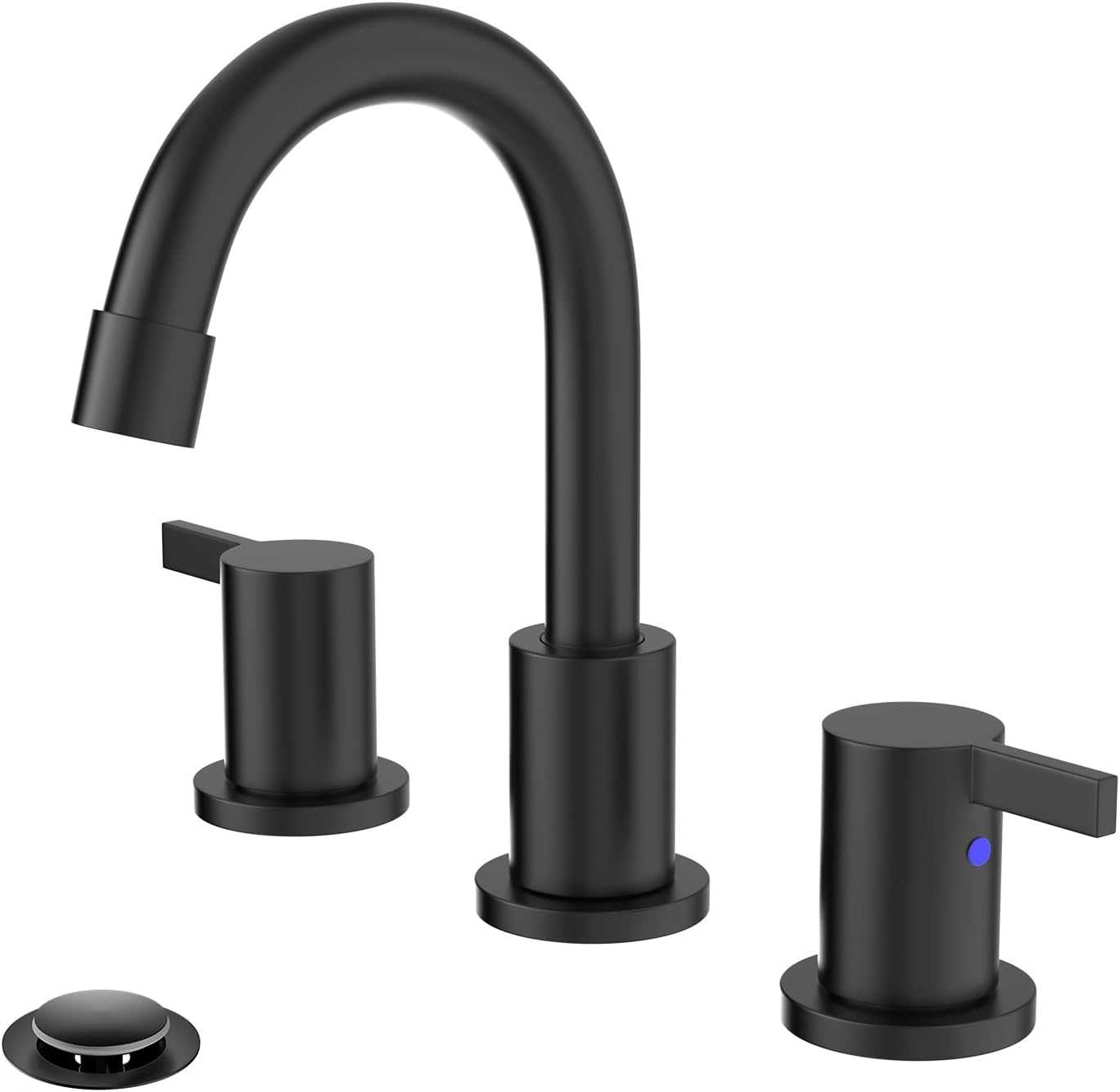 Phiestina 8 Inch 3-Hole Matte Black Widespread Bathroom Sink Faucet with Valve and Metal Pop-Up Drain Assembly, 2-Handle Low-Arch Bathroom Faucets Three Hole, WF15-1-MB