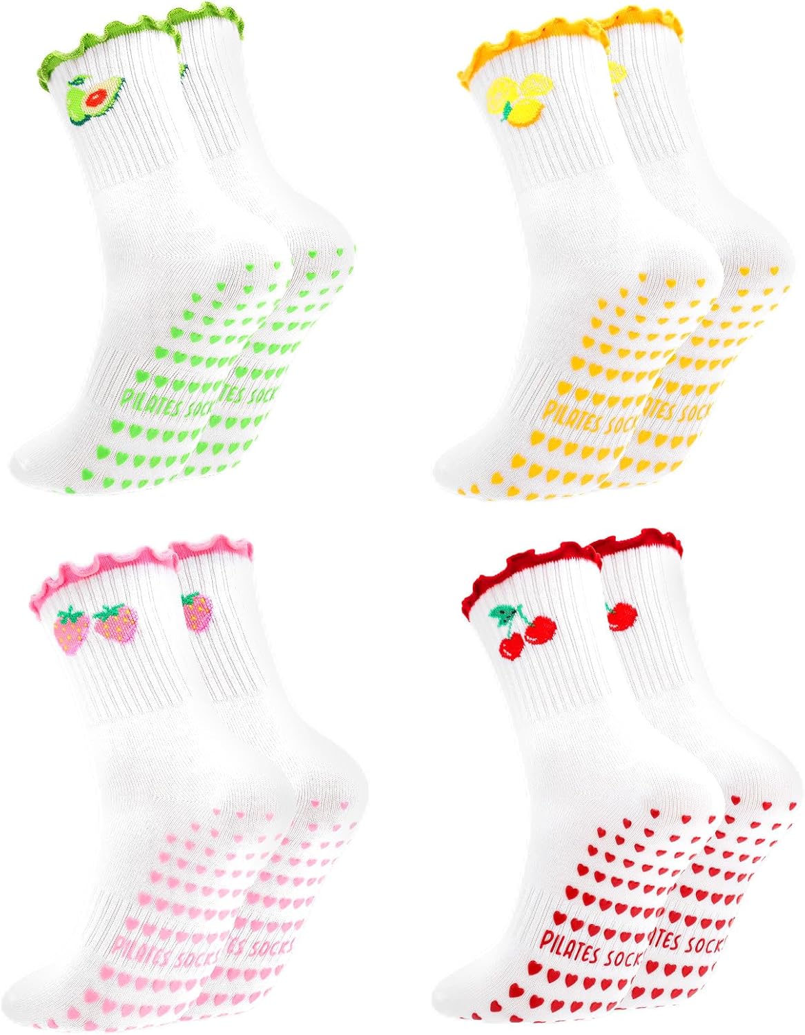 4 Pairs Cute Pilates Socks with Grip for Women Cotton Fruit Grippy Yoga Socks Ruffle Cuff Non Slip Crew Sock for Workout Athletic Hospital Ballet
