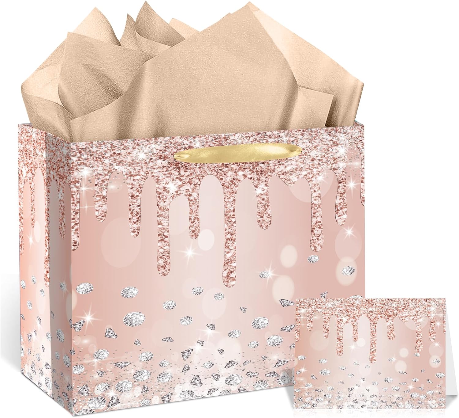 - What You Get: The rose gold gift bag set includes 1pcs large gift bag, 1pcs greeting card, and 3pcs tissue paper. The glitter rose gold paper bag measures 11.8x9.4x5.3 inches, the space is large so the bag is suitable for various gifts. So the glitter pink gift bags are the ideal choice for you to send gifts that are both beautiful and functional