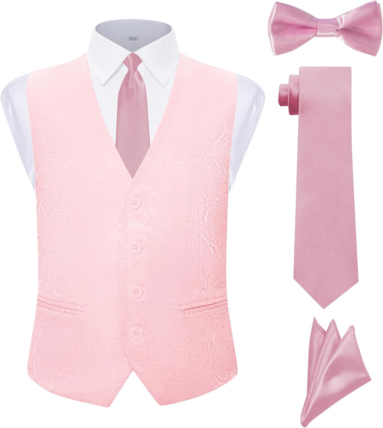 Boys Vest 4 Piece Paisley Boy Suit Vests Set for Kids Jacquard Waistcoat with Bowtie, Necktie, Pocket Square