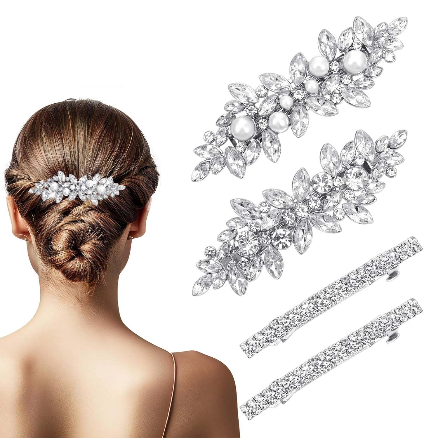 4 PCS Sparkly Rhinestone Hair Clips for Women, Hair Barrettes, Flower Crystal Hair Clips, Silver Hair Accessories, Dressy Hair Clip for Wedding Bridal Party