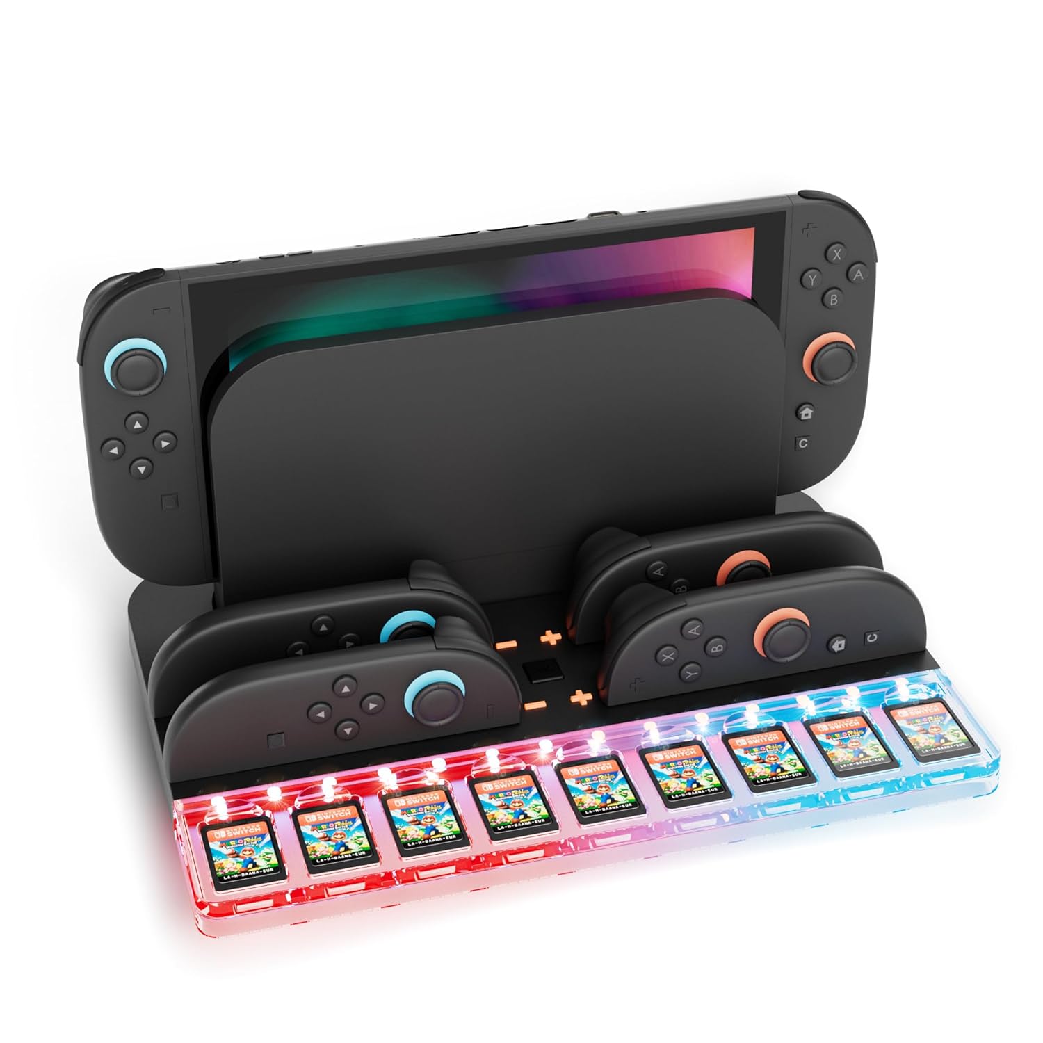 - RGB Lighting: The game card slot of the charging dock can be customized with 7 modes of RGB lighting, adding a fashionable touch to your gaming space.The ambient light button allows you to control the lighting and create a unique atmosphere.