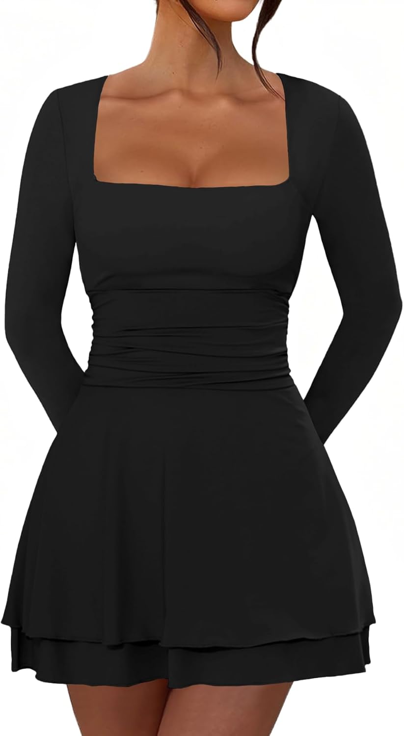 Women's Square Neck Mini Dress Long Sleeve Ruffle Hem Corset Ruched Waist Short Party Dresses