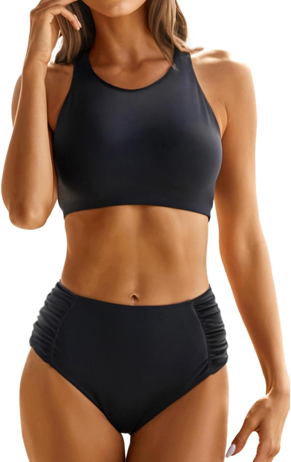 Holipick Women High Waisted Two Piece Bikini Set Racerback Bathing Suit Sporty Crop Top with Bottom for Teen Girls