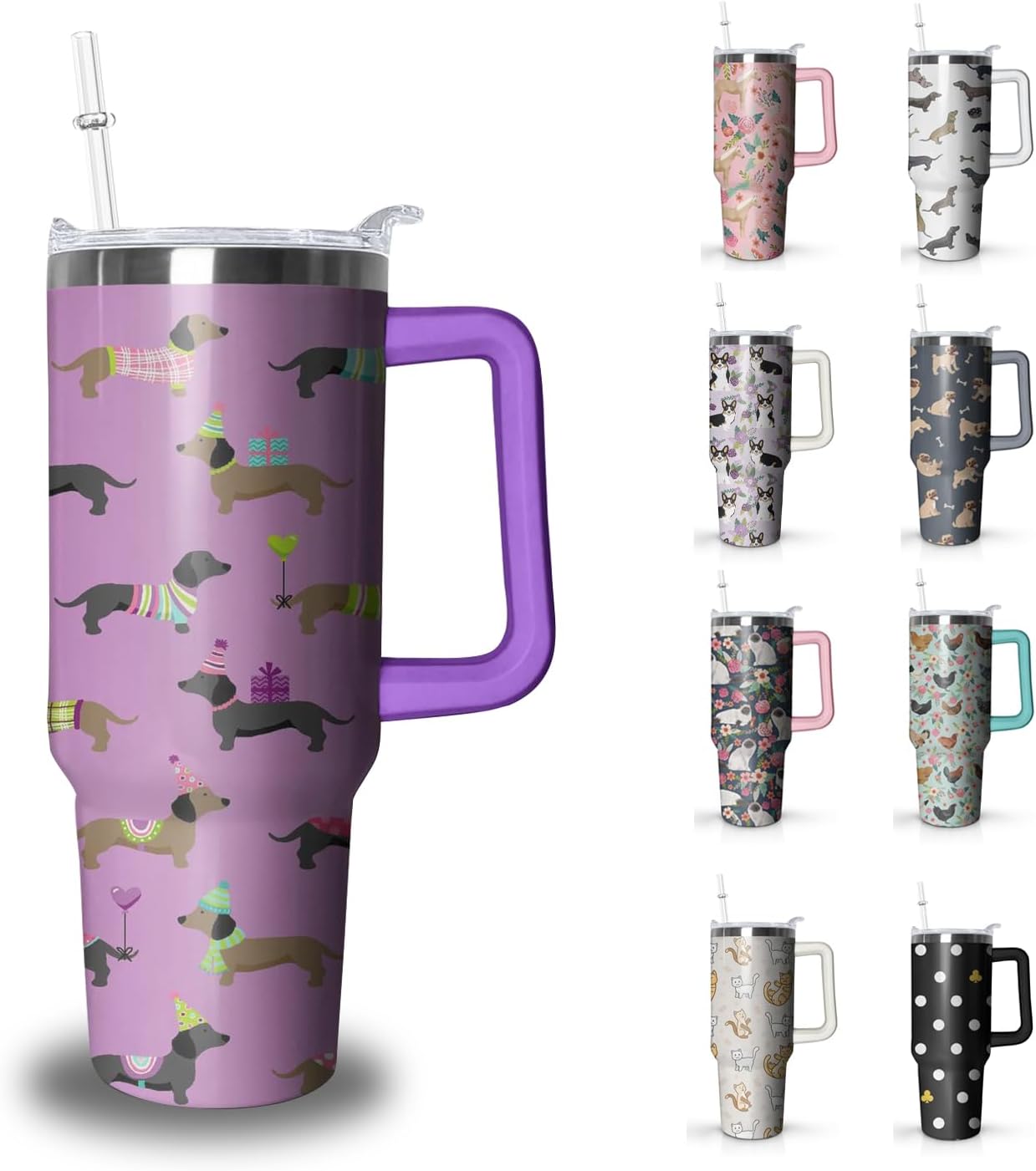 Purple Dachshund Tumbler with Handle and Straw, 40 oz Dog Stainless Steel Insulated Cup with Straw,Travel Coffee Mug Water Bottle, Birthday Christmas Mothers Day Gifts for Animal Lovers Women