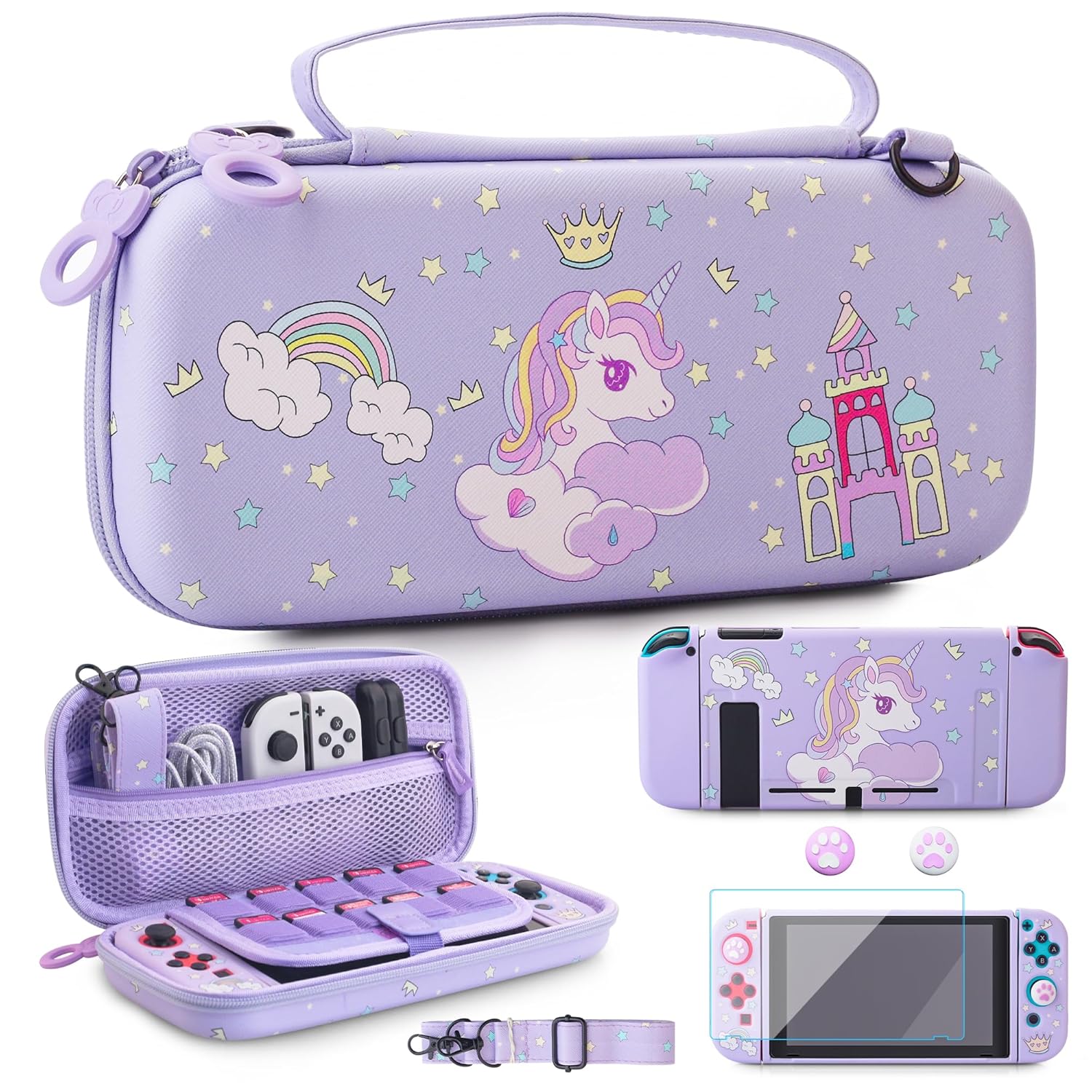 - 【You Can Get】1 x Purple Carrying Case for Unicorn; 1 x Soft TPU Cover for Nitendo Switch ; 1 x Glass Screen Protector; 2 x Cute Thumb Caps; 1 x Shoulder Strap; and long-term friendly customer service. If you have any questions, please feel free to contact us.