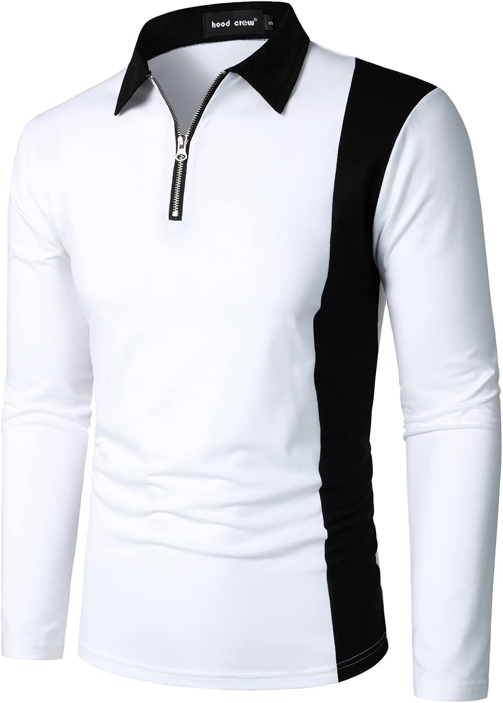 HOOD CREW Mens Long Sleeve Polo Shirts Fashion Color Block Zipper T Shirts