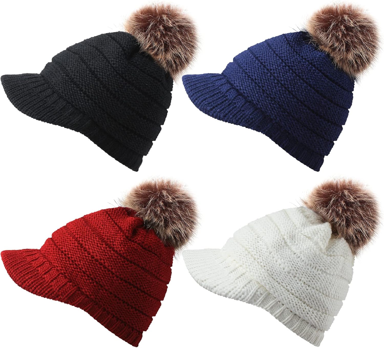 Zhanmai 4 Pcs Women Ribbed Knit Hat with Brim Pom Pom Brim Beanie Hats Soft Warm Slouchy Beanie Cap with Visor for Winter Outdoor, 4 Colors