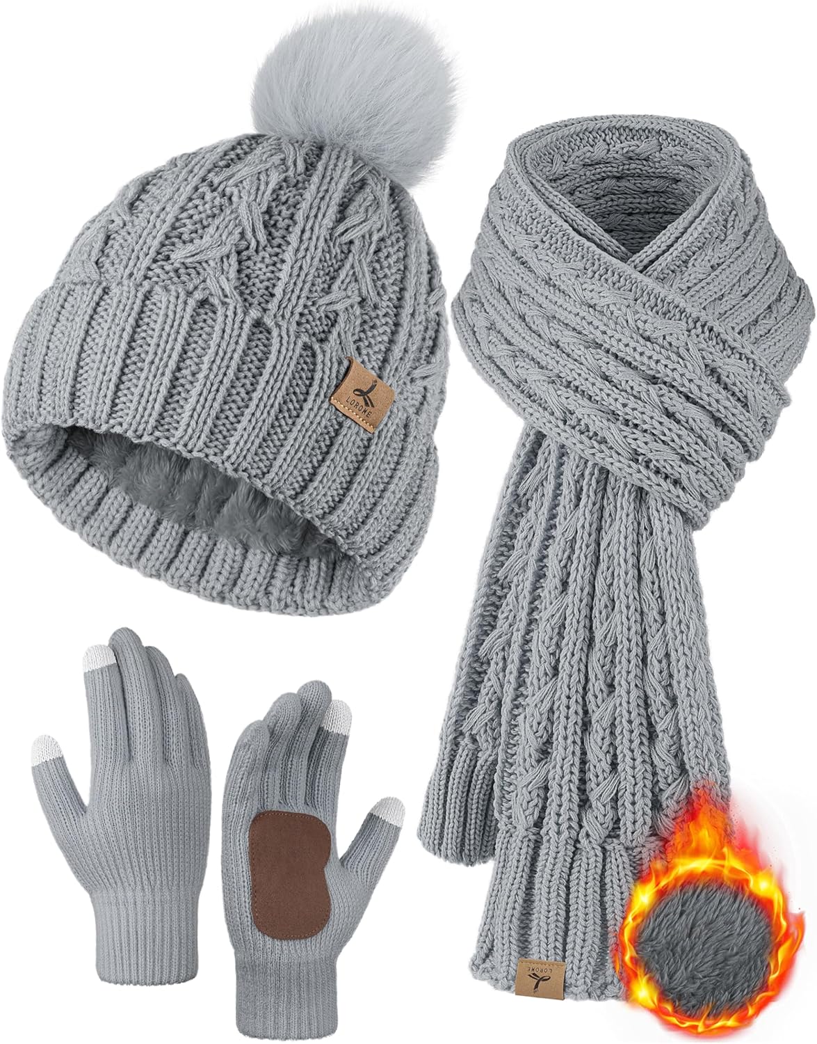 Winter Hat Scarf Gloves Set,Fleece Lined Pom Pom Beanie Hat Warm Knit Long Scarf Touchscreen Gloves Winter Gifts for Women